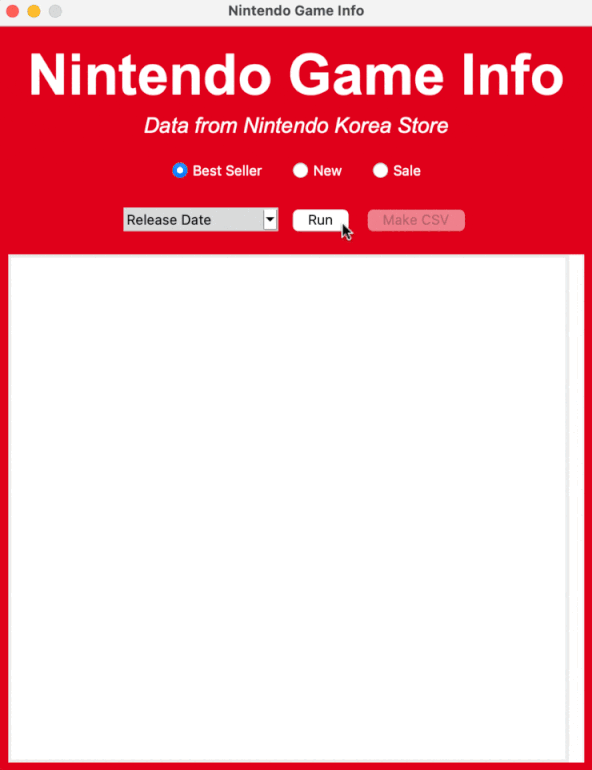 Make CSV버튼을 통해 수집된 게임 정보를 CSV 파일로 저장할 수 있다.- 해당 버튼은 데이터 수집이 완료된 이후에만 활성화된다.